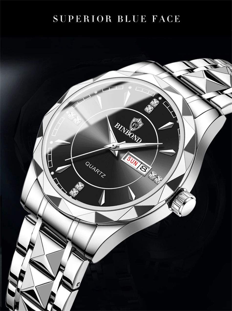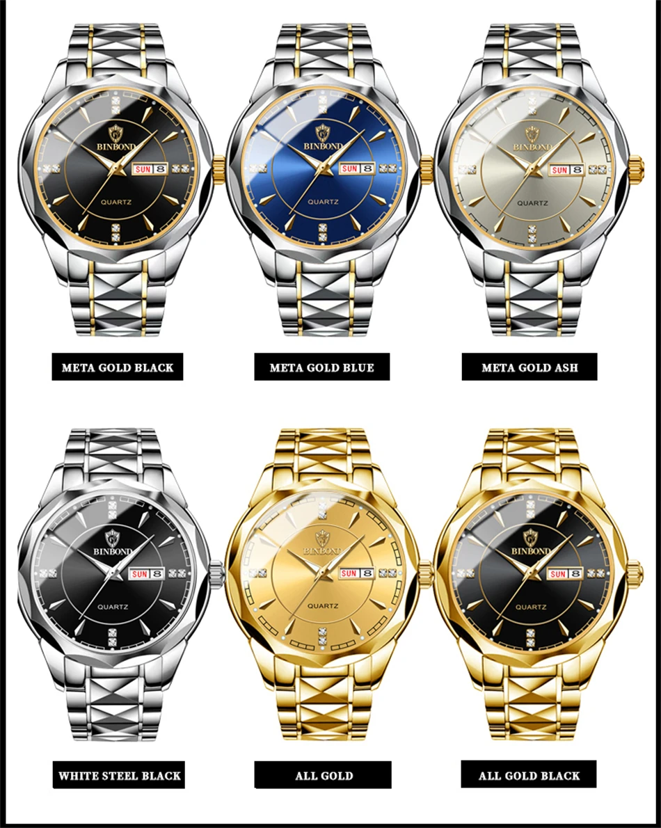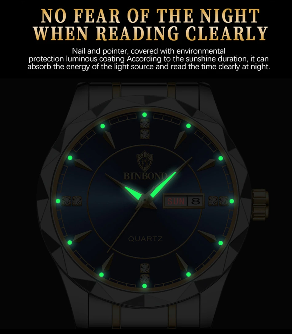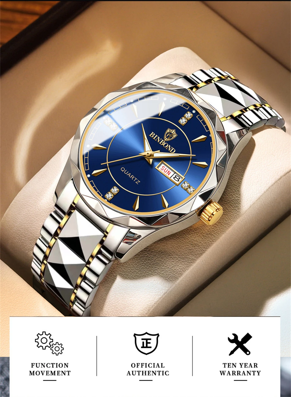 2025 New Watch Diamond Luxury Night Glow Double Calendar Quartz Movement Gold Blue Stainless Steel Fashion Business Man Watch