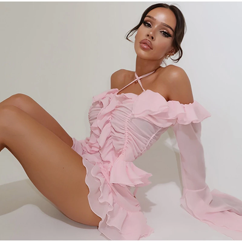 Obsessed with this light pink off - shoulder dress! The flared sleeves and ruffles exude a sweet, girly charm. Ideal for a date night or a party.✨Dreamy Elegance