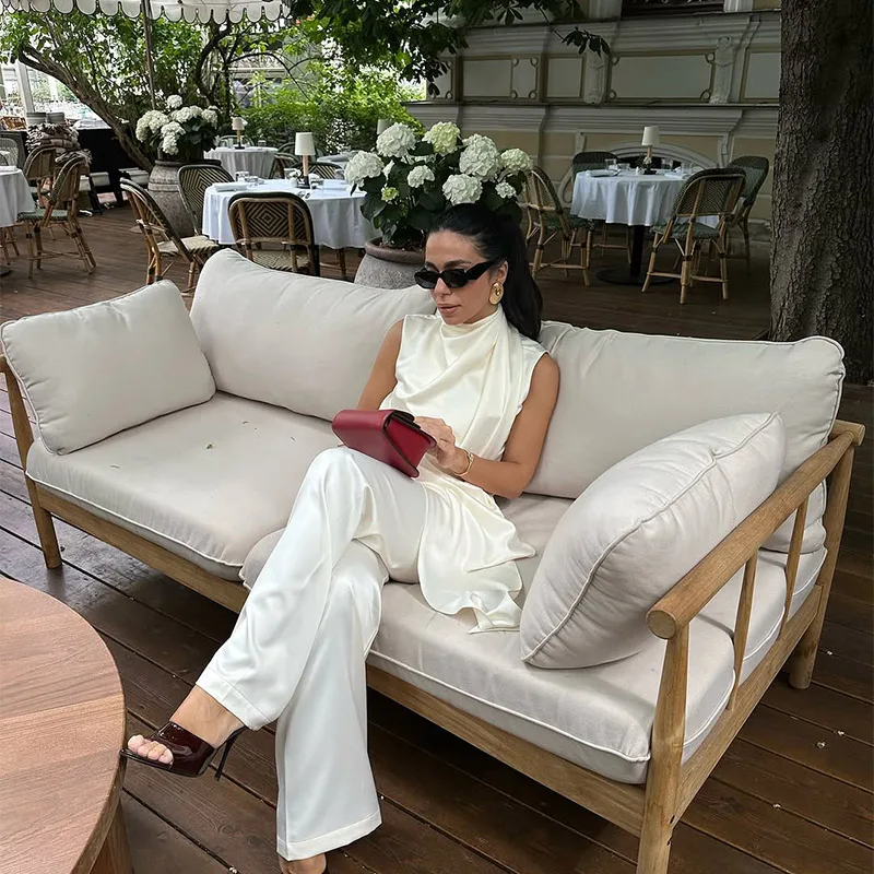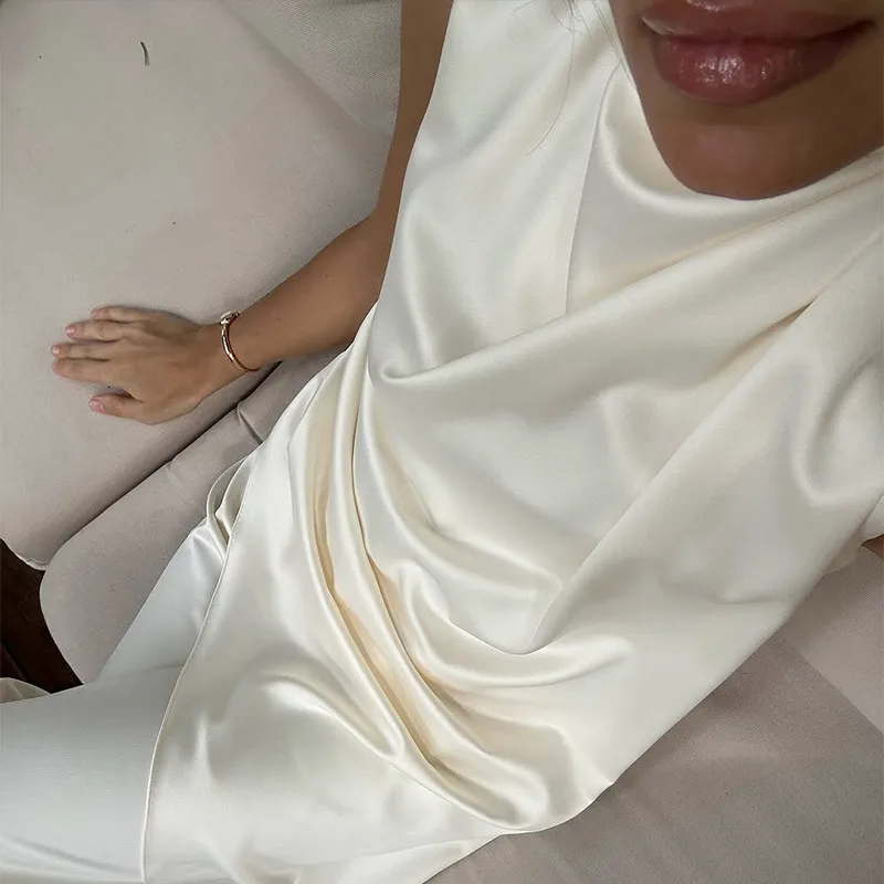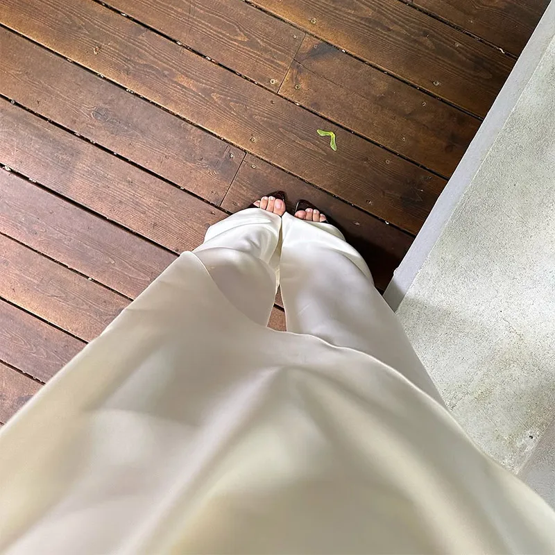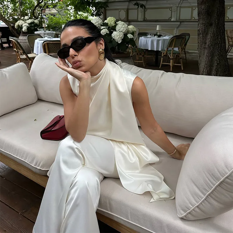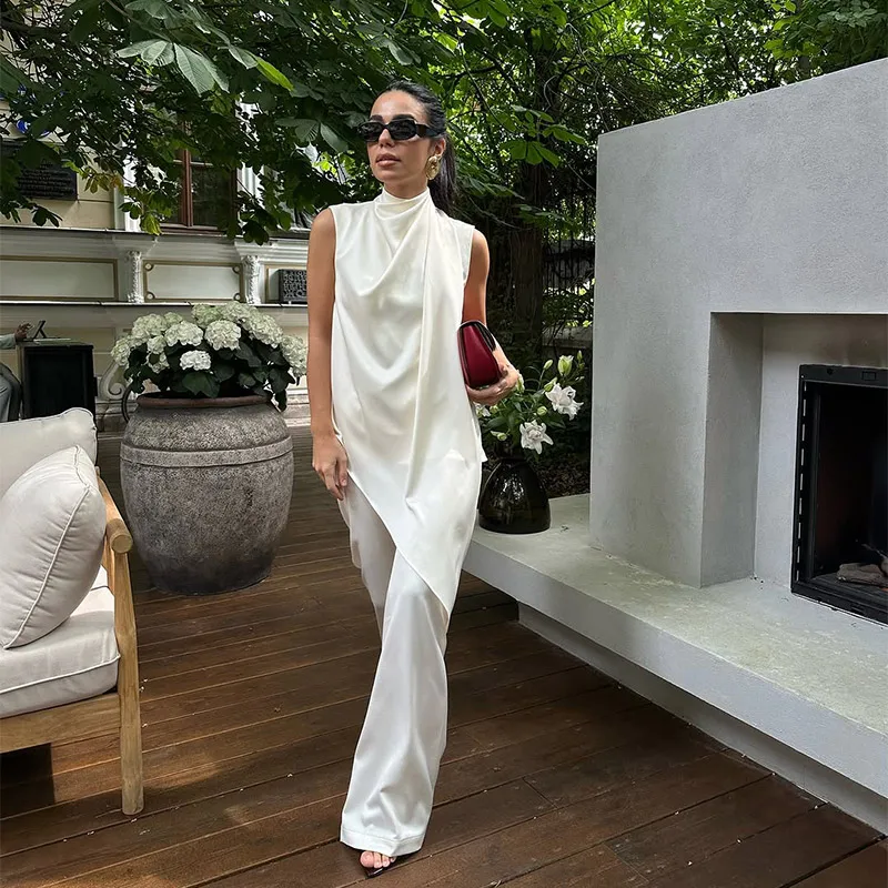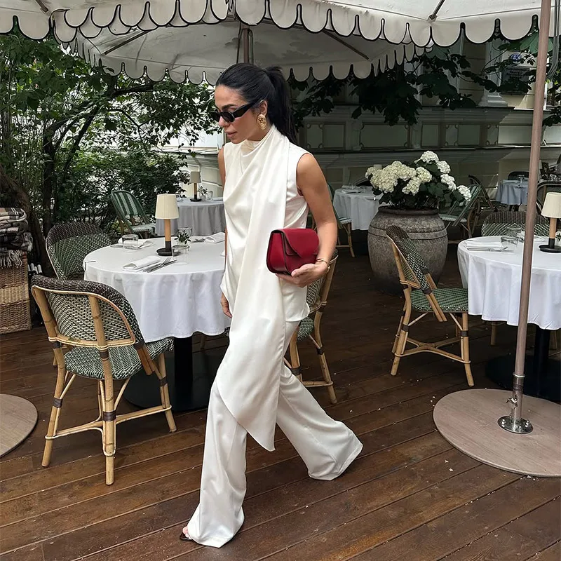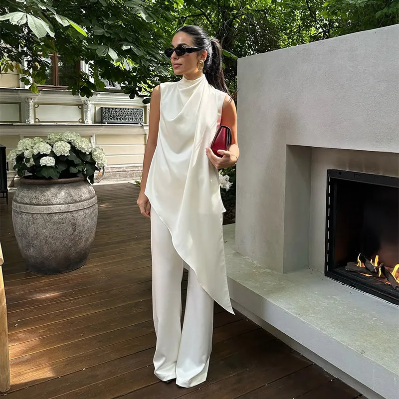 Elegant White Satin Vest Pants Suit Women Chic Sleeveless Irregular Hem Top Wide Leg Pants Set Fashion Female High Street Wear