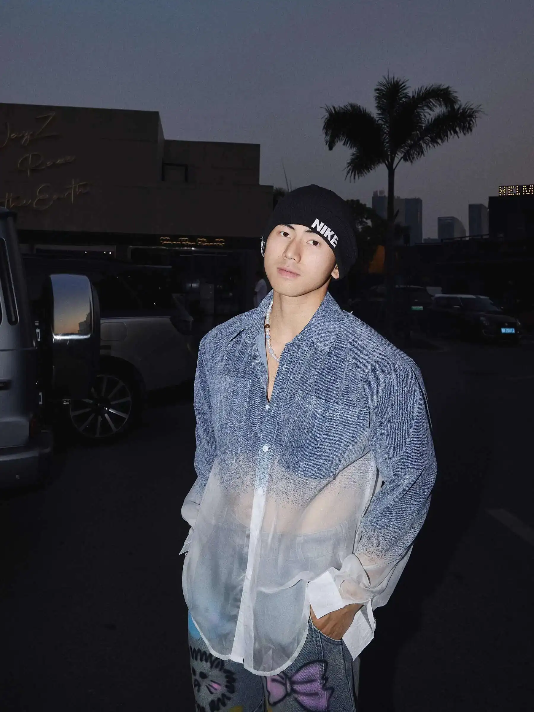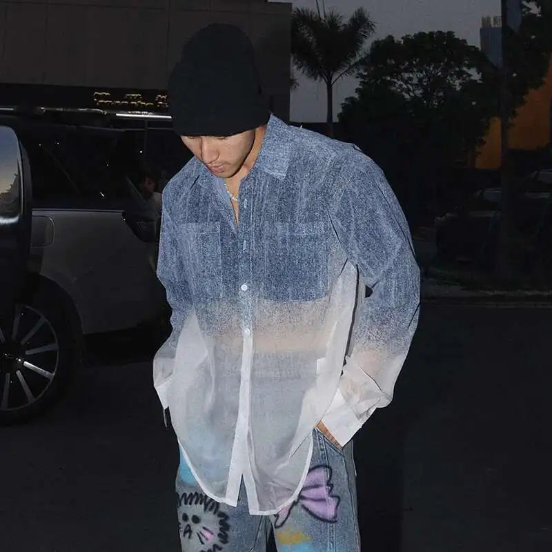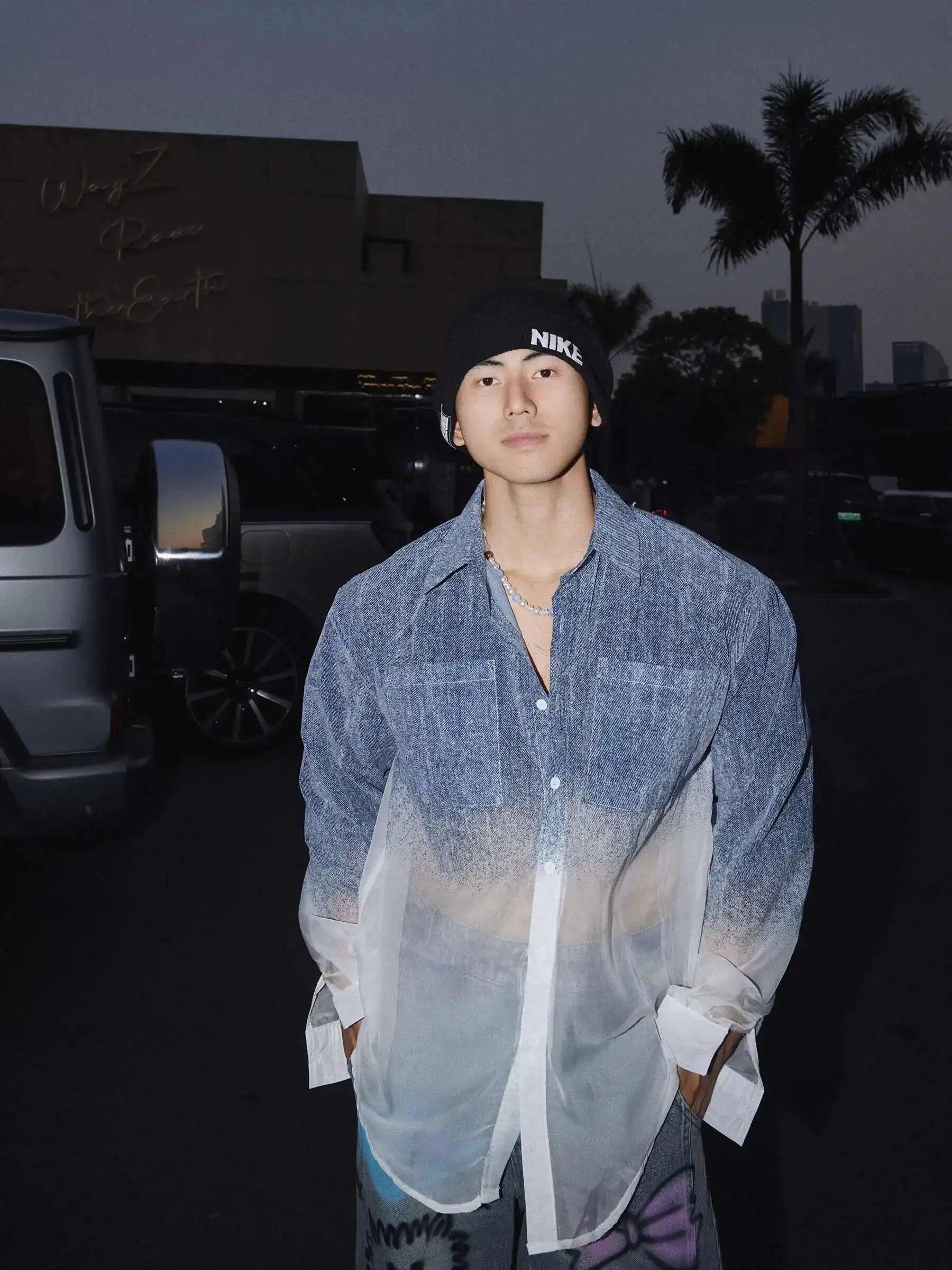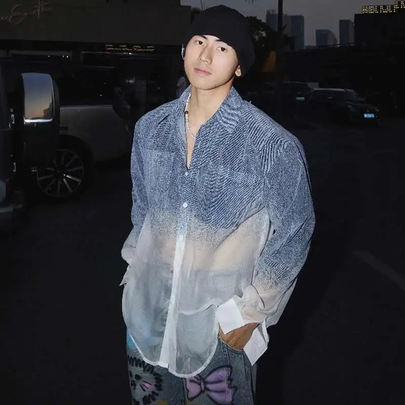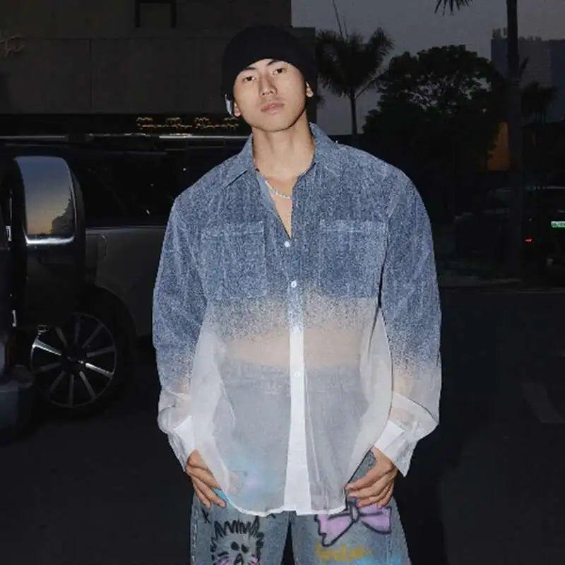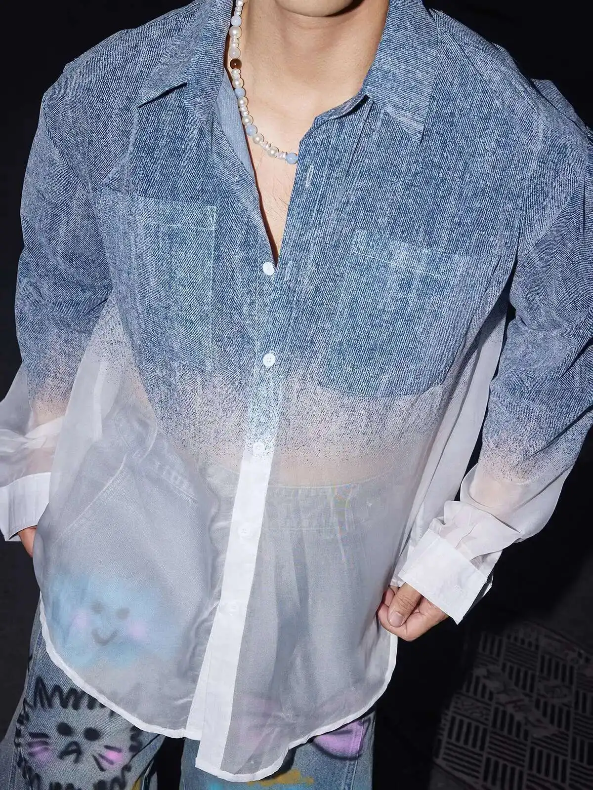 FEWQ Niche Design Men's Shirts Lapel Denim Single Breasted Long Sleeved Casual Gradient Color Loose Male Pocket Top Chic 24K3470