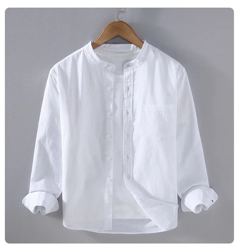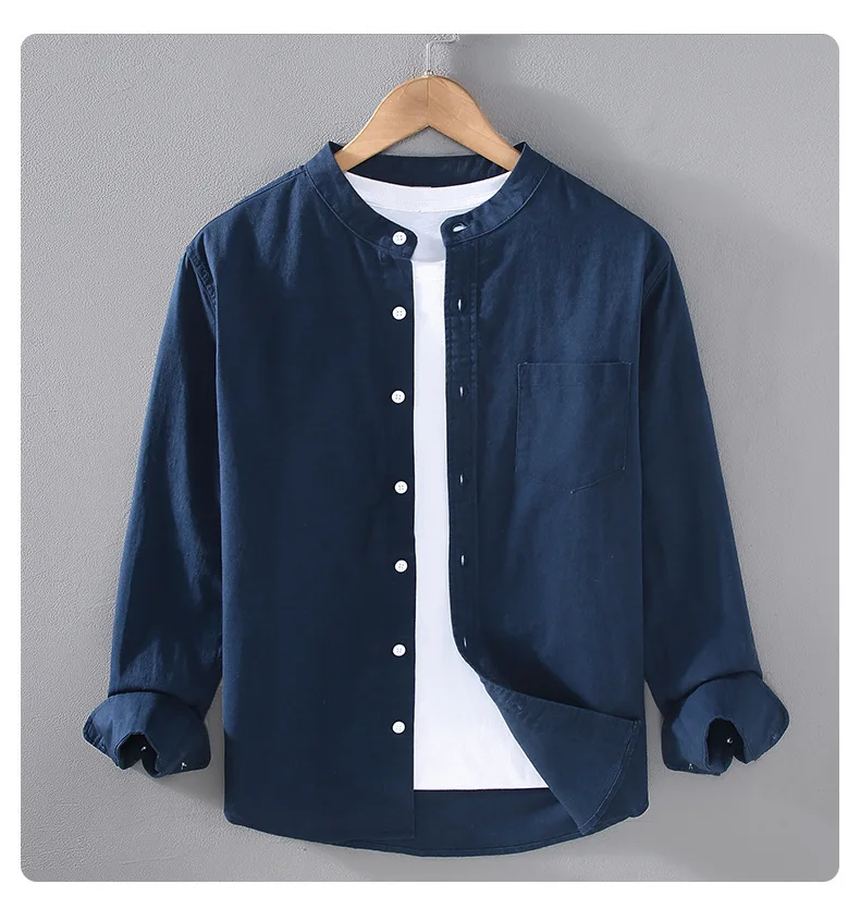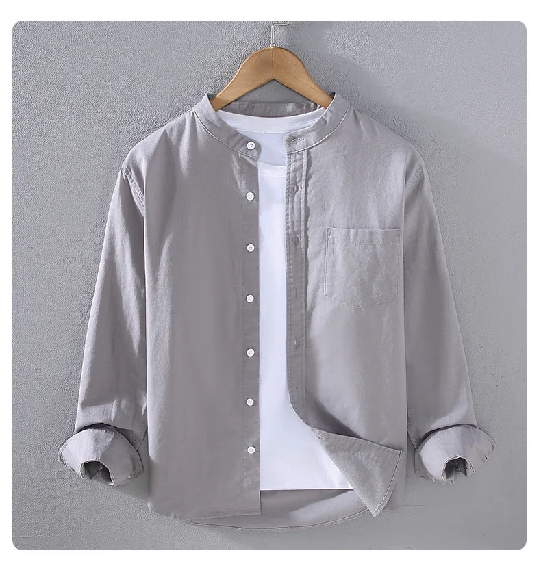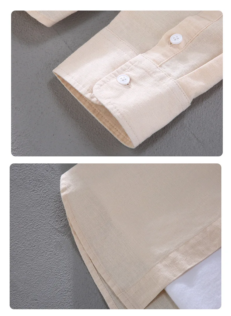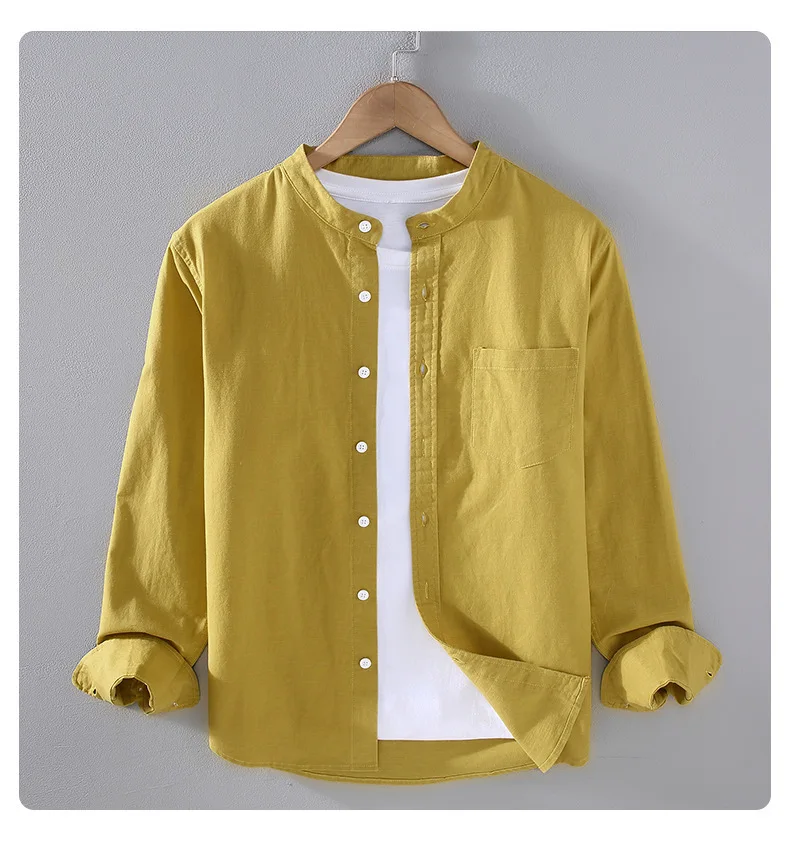 Japanese Mens Linen Cotton Thin Shirt Harajuku Stand Collar Long Sleeve Solid Color Shirts Male Casual Breathable Classical Tops