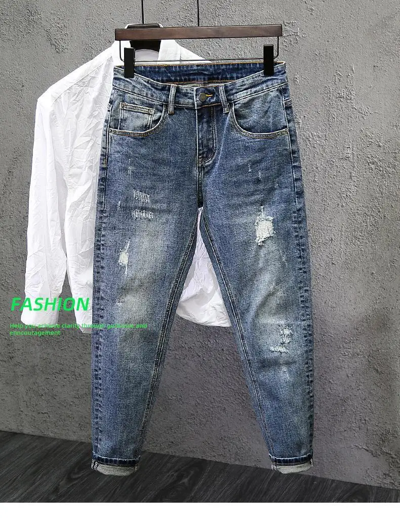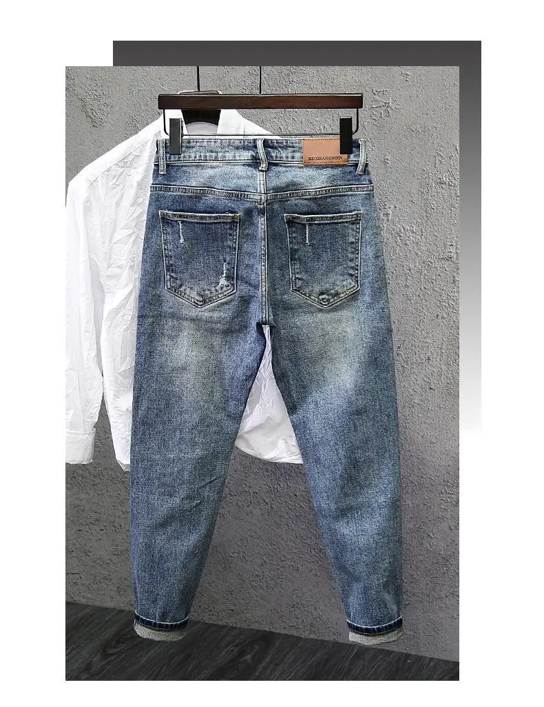 Jeans Ripped Trendy High Street Men's Long Pants Men's Brand Knees 2025 New Spring Autumn Slim Feet Streetwear Men Blue Jeans