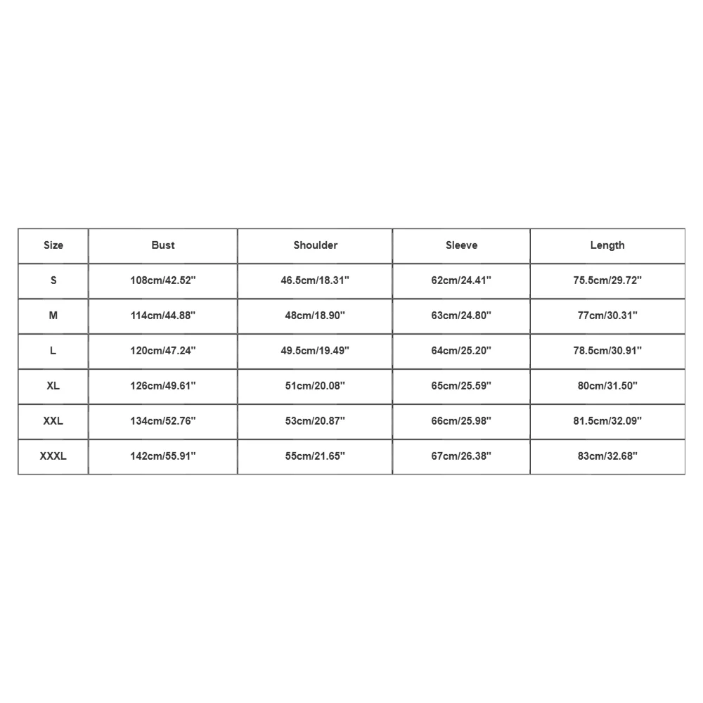 | Size:XXL | Bust:134cm/52.76'' | Shoulder:53cm/20.87'' | Sleeve:66cm/25.98'' | Length:81.5cm/32.09'' |