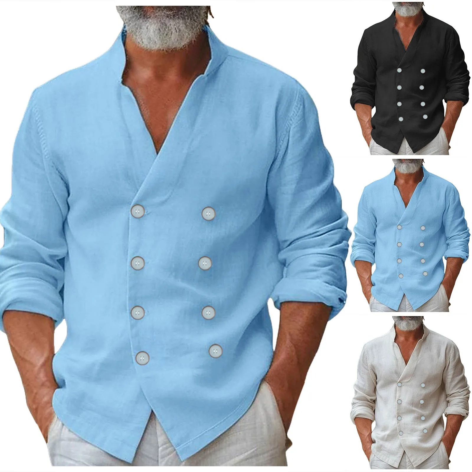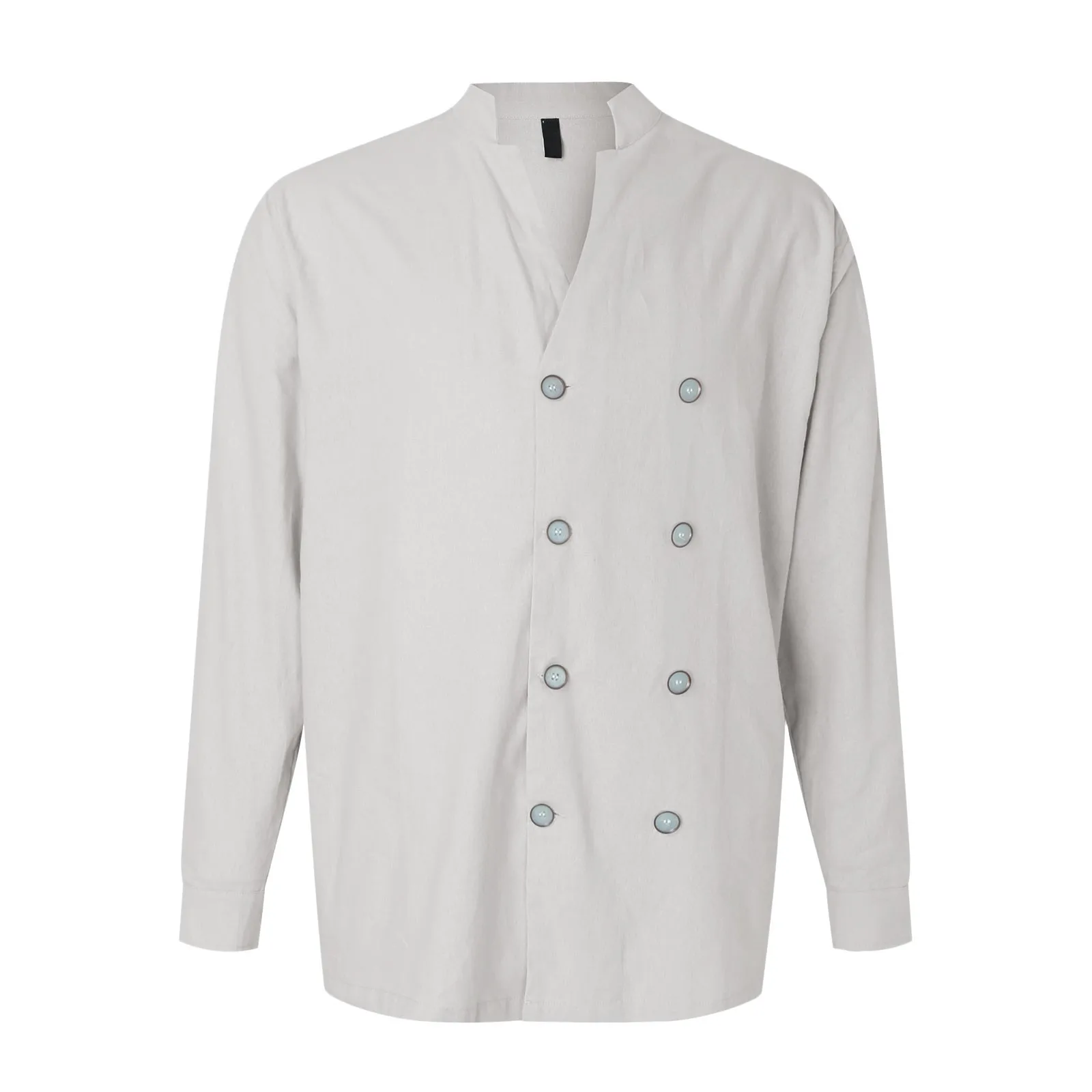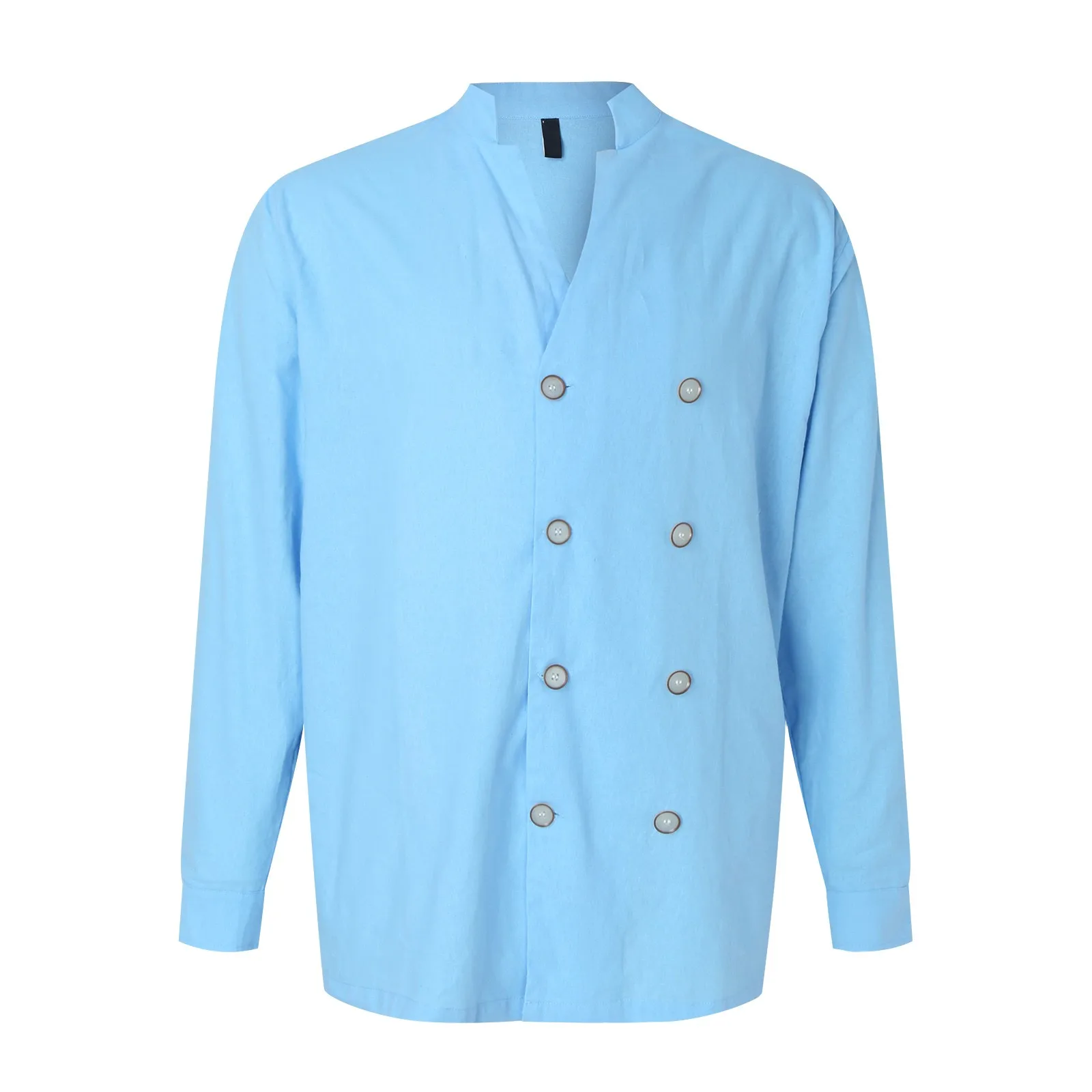 Mens Double Breasted Stand Up Solid Color Long Sleeved Shirt
