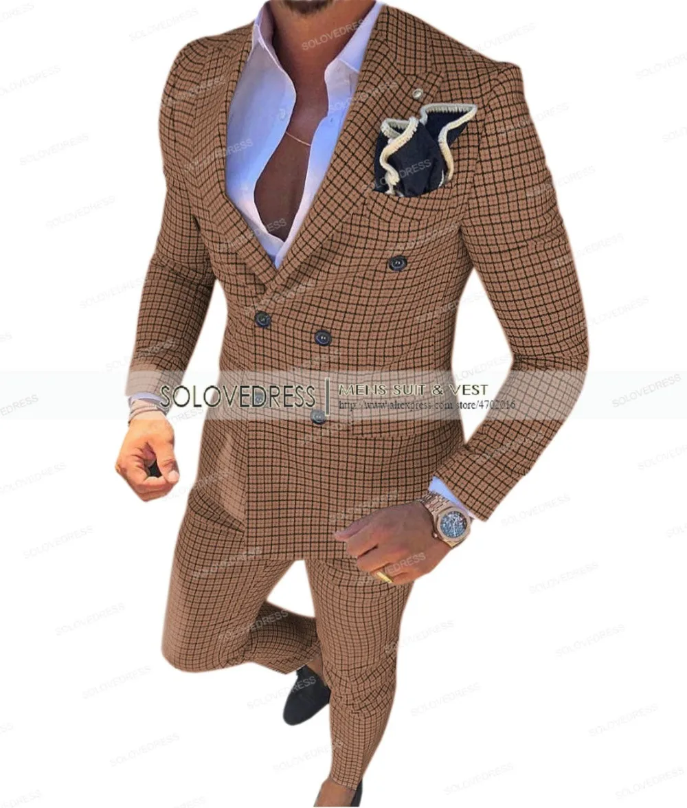 Men's Suit Brown Formal 2 Pieces Slim Fit Double breasted Plaid Soft Wool Tweed Prom Tuxedos Wedding Groomsmen (Blazer+Pants)