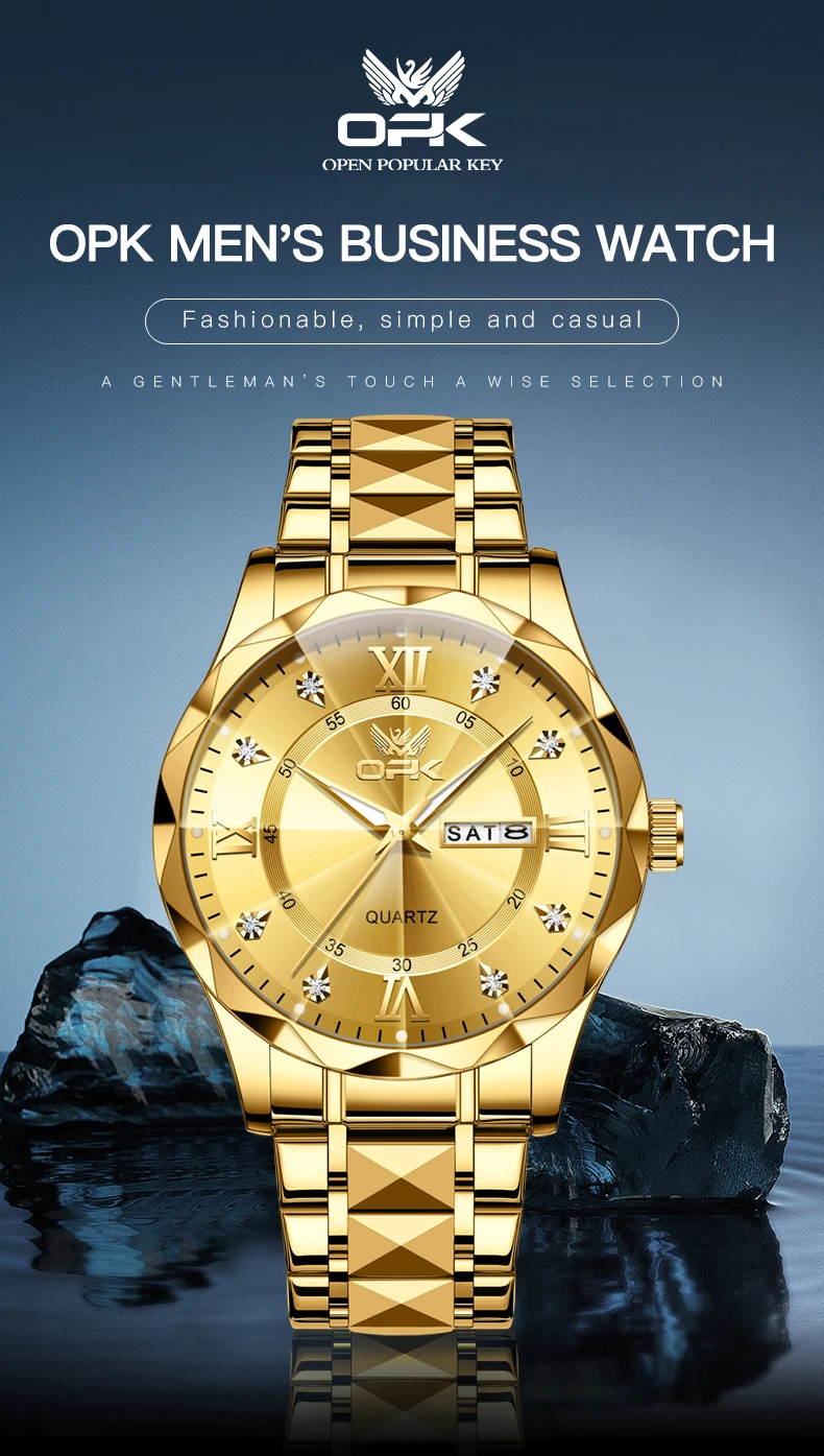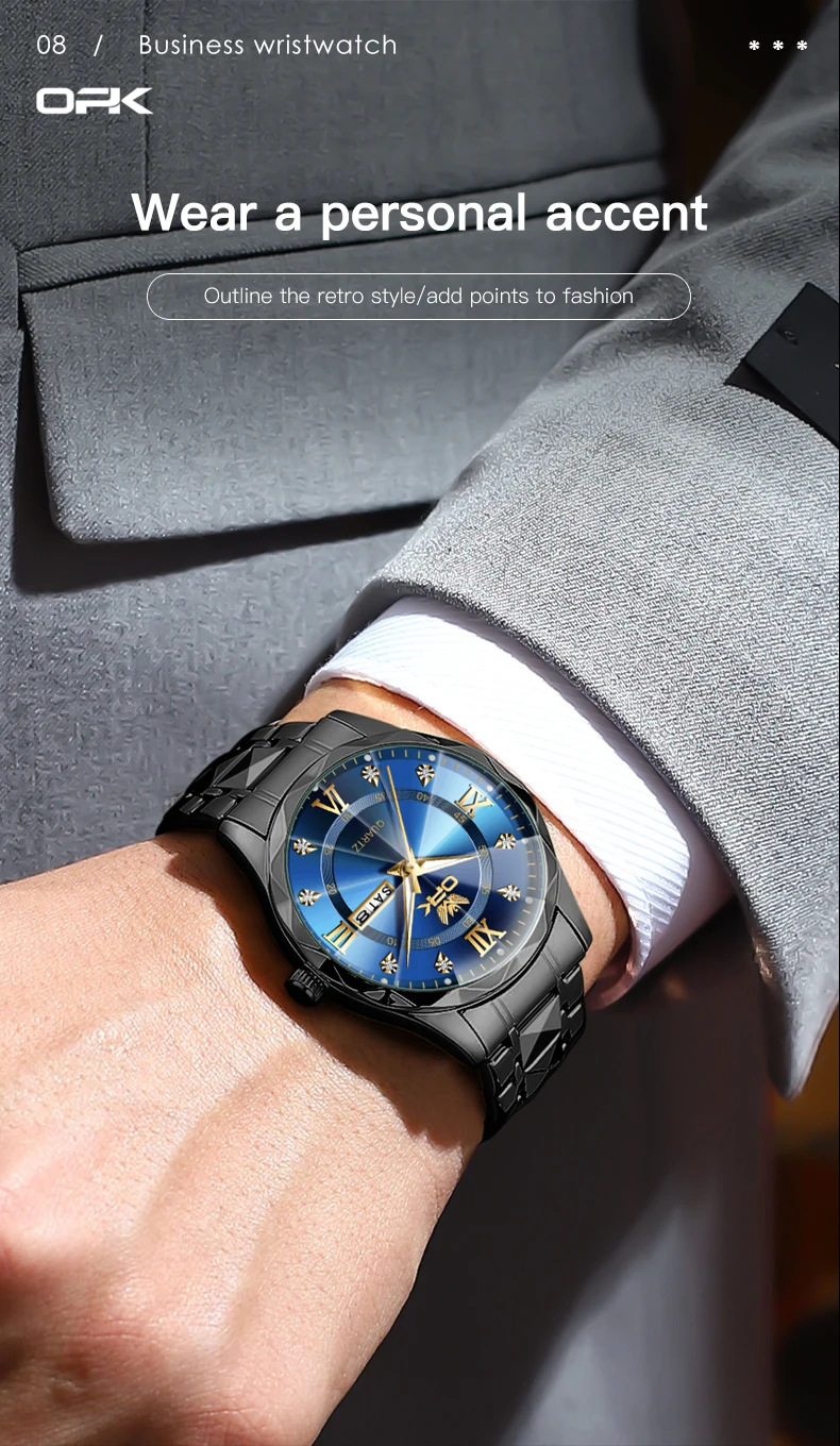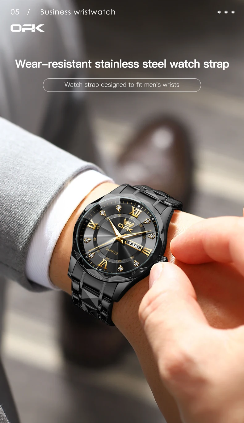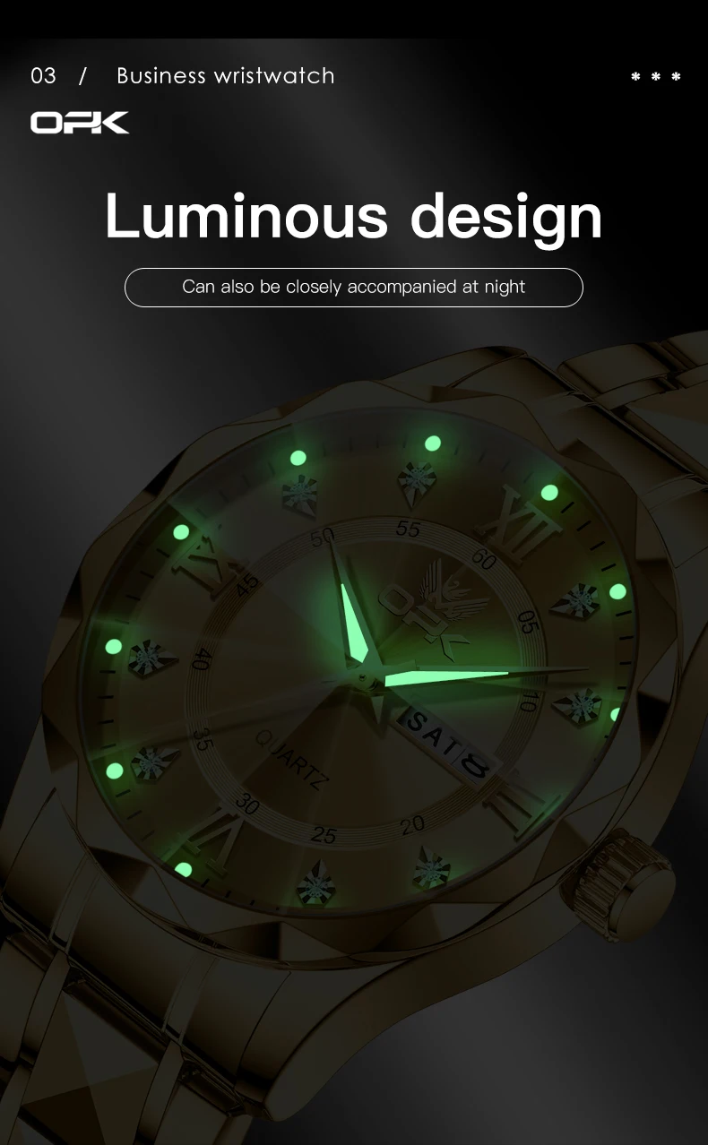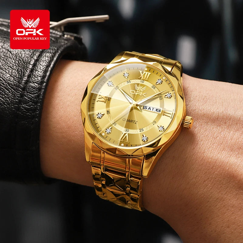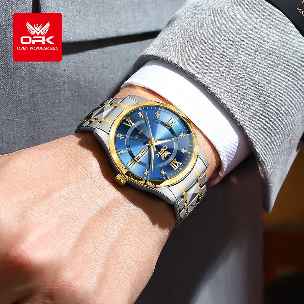 OPK Brand men's steel strap quartz watch dual calendar waterproof night light 6023