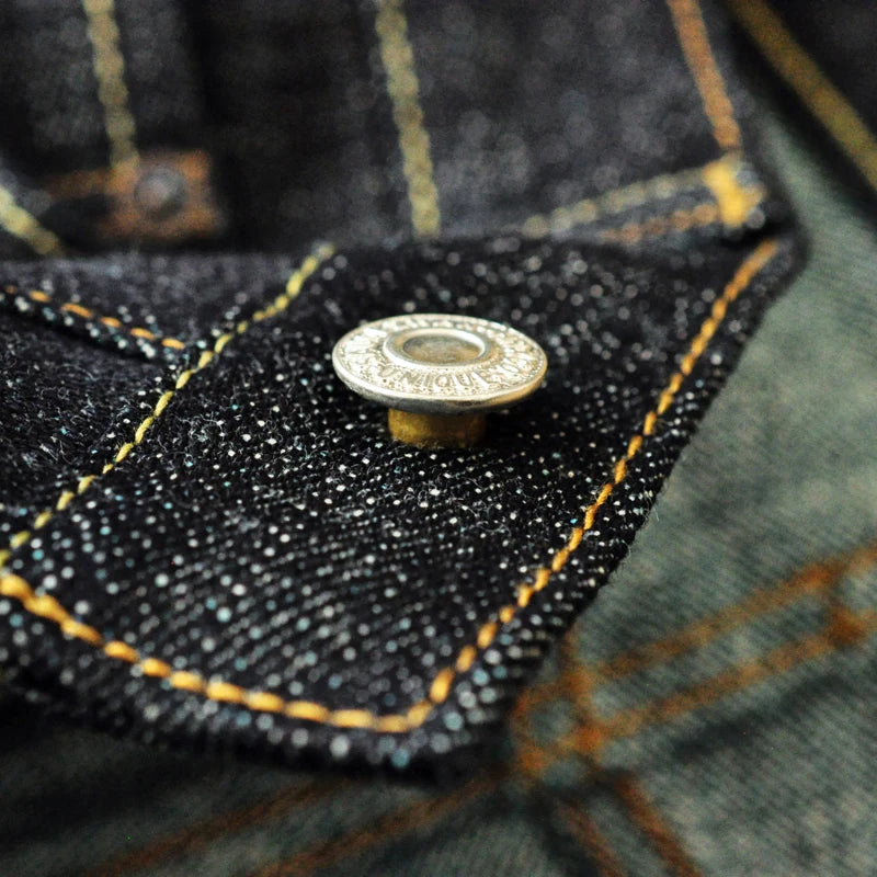 This jeans uses five characters (Wind, Forest, Fire, Mountain, Thunder) for design and development, and hires professional designers to complete the visual design of the appearance. After saucezhan started the fabric development plan, it invested a lot of money, which is one of the firecracker festival series fabrics. The gram thickness of the fabric is 16.8 oz. It has been pre-shrunk and the shrinkage rate is about 2%. Please choose the same size as you often use. Firecracker fabric means the use of very thick slub yarn for weaving. The raised yarns can be clearly seen on the front of the fabric, but the protrusions of common fabrics are arranged longitudinally. This fabric is arranged horizontally with raised yarns, and the front and back sides of the fabric have obvious characteristics.