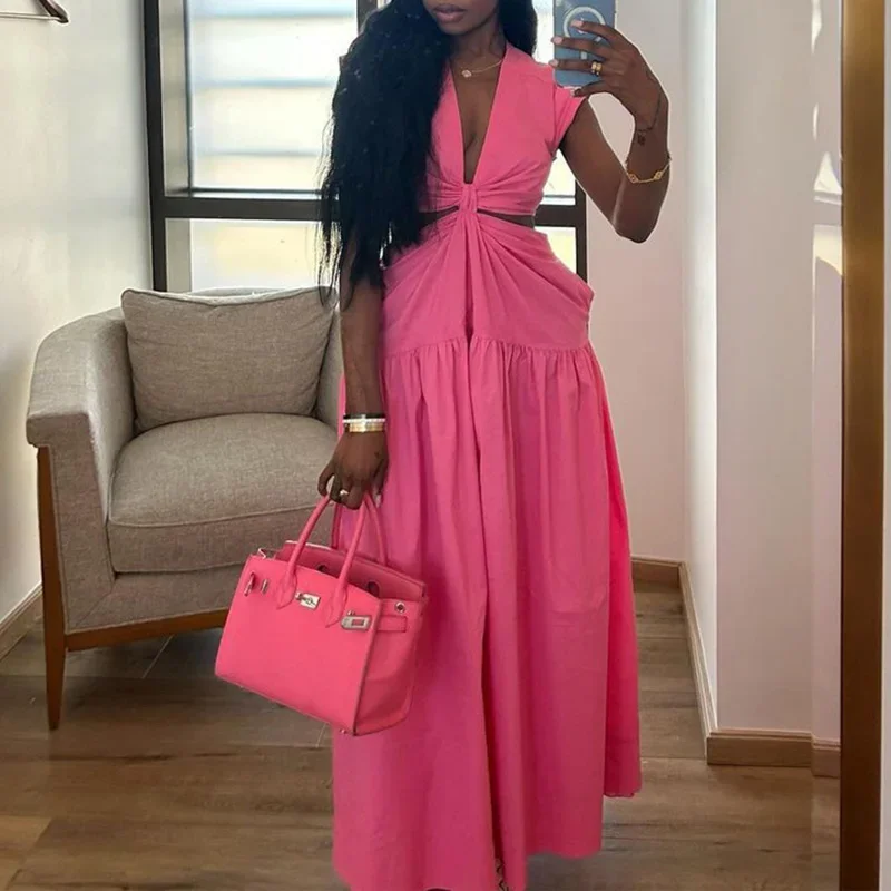 Simple Solid Color Hollow Waist Pleated Dress Elegant Lady Deep V-neck Loose Long Dress Summer Sleeveless Commuting A-line Dress