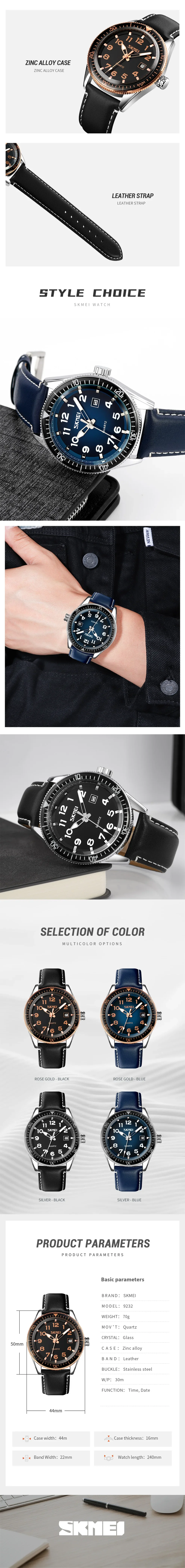 SKMEI 9232 Luxury Simple Sport Waterproof Men Business Mens Quartz Watches Leather Dial Wristwatches Calendar Clock Reloj Hombre