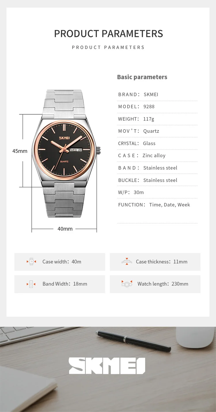 SKMEI 9288 Mens Waterproof Business Wristwatches Man reloj hombre Casual Quartz Clock Male Full Steel Time Week Sports Watch