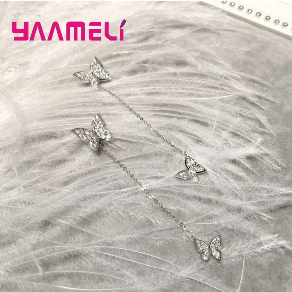 Solid 925 Silver Earring Cute Full Rhinestone Cubic Zircon Inlay Paved Butterfly Thread Pendientes Jewelry for Female Femme Gift