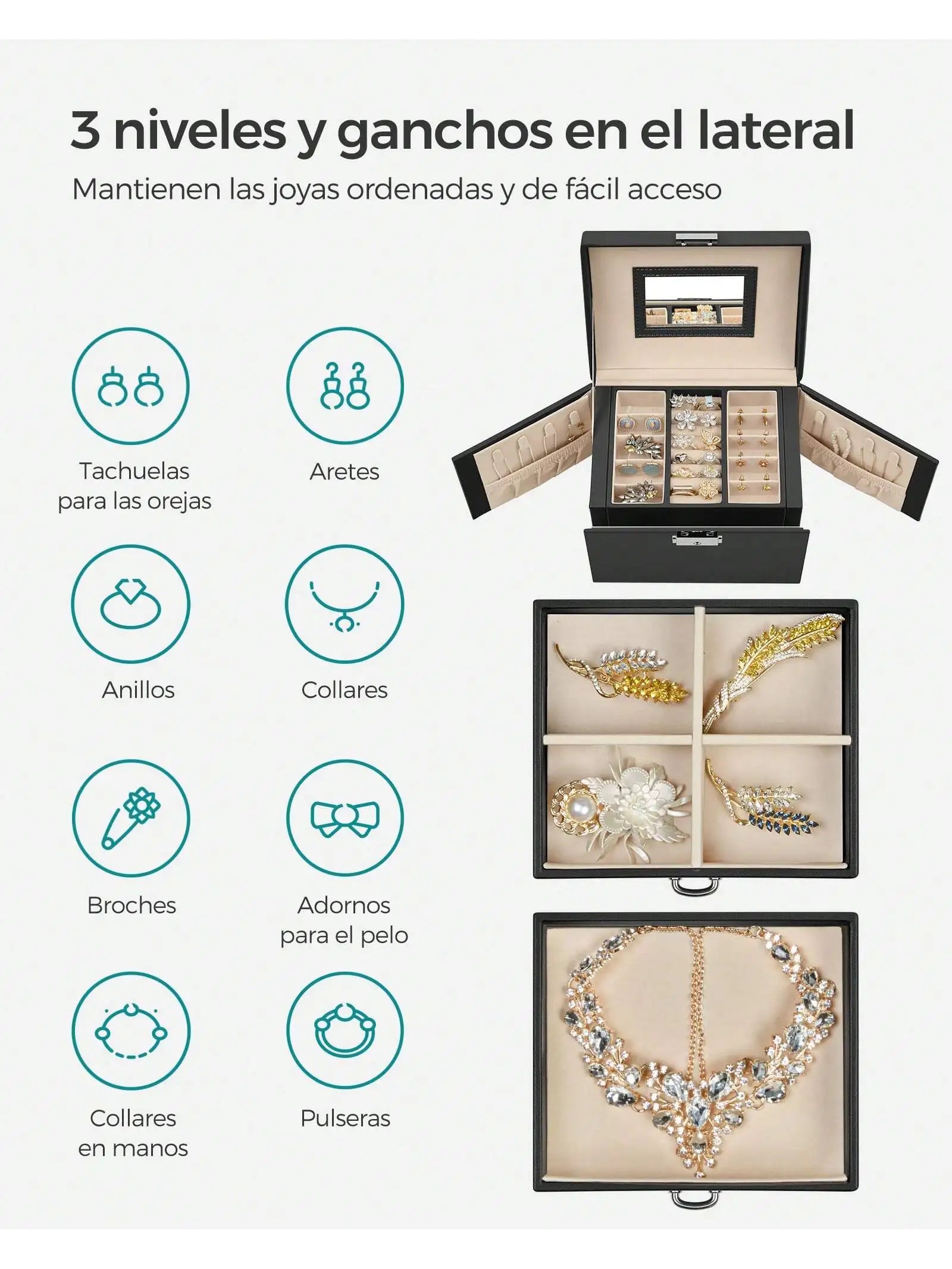 SONGMICS 3-TierJewellery Box,Lockable Organiser with Handle,2 Drawers,Travel Case with Mirror,Jewellery StorageModern Style Gift
