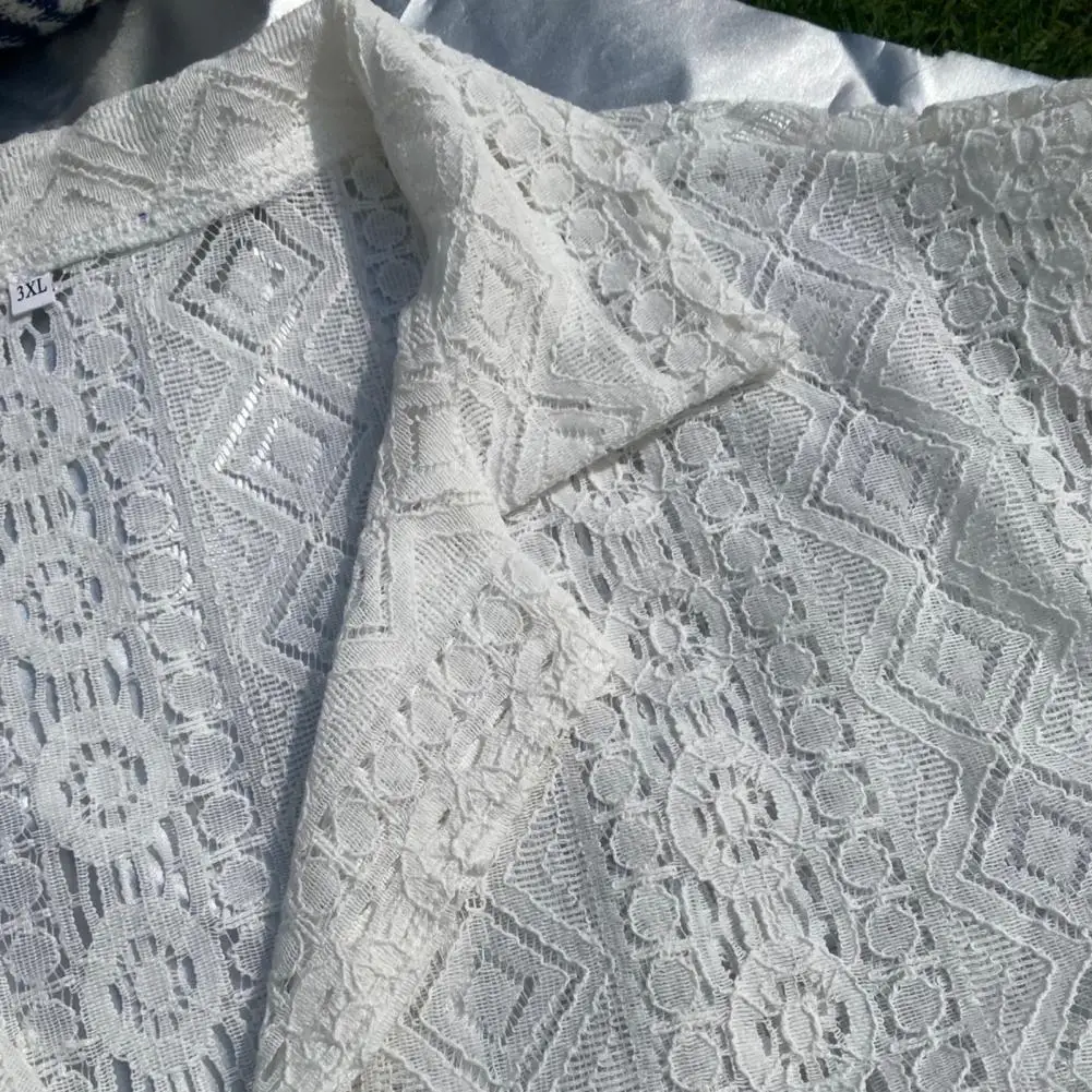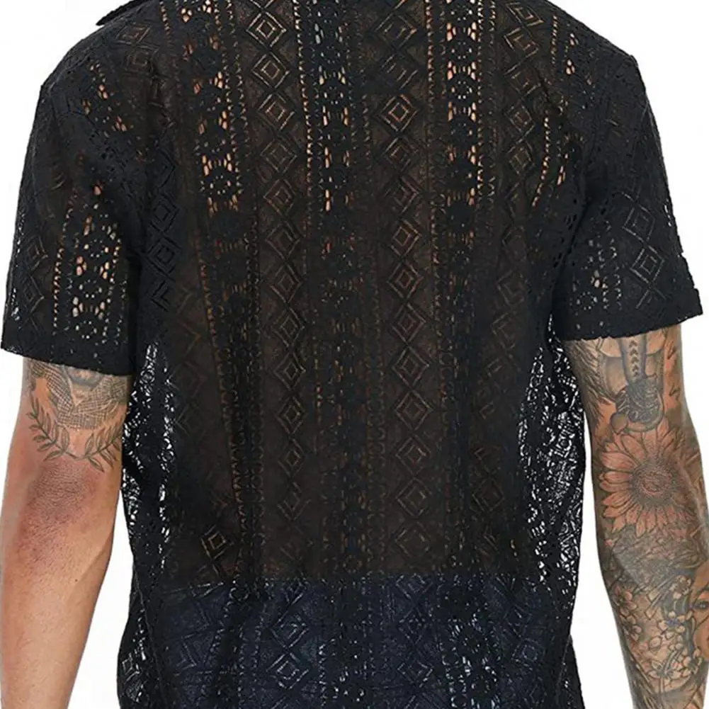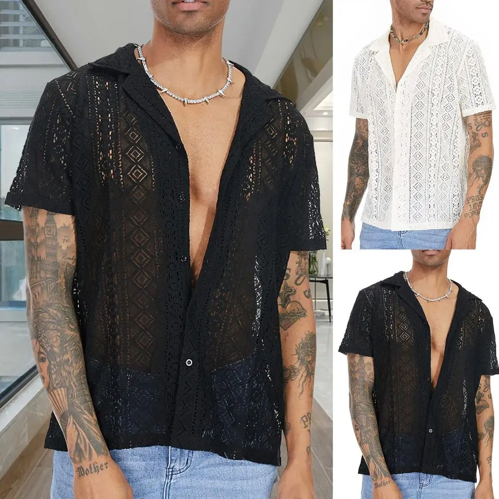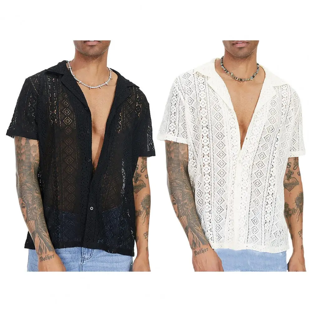 Summer Men Shirt Solid Color Hollow Out Lapel Short Sleeves Single-breasted Men Top Loose Mid-length Lace Male T-shirt